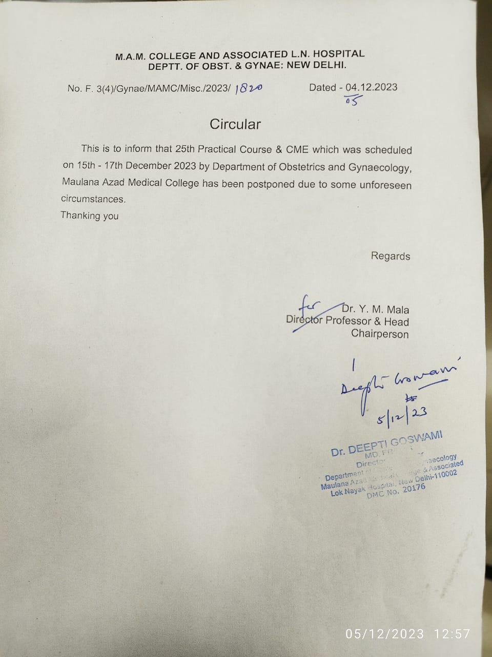 Cancellation of 25th Practical Course and CME Organised By Department of Obstetrics and Gynaecology On 15-17 December 2023