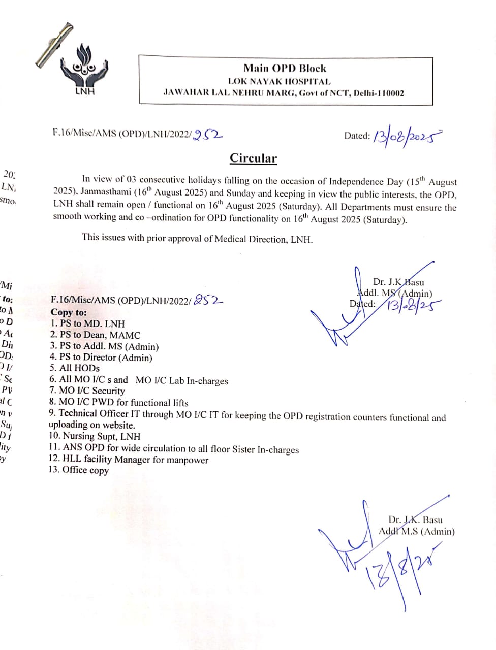 Circular: LOK NAYAK HOSPITAL OPD To Remain Open On 16th August 2025 (Saturday)